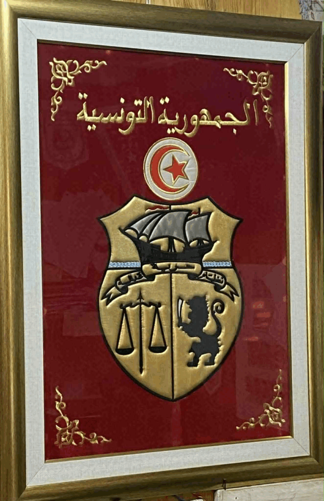 Fabrication et impression d’emblèmes officiels et de l’hymne national tunisien pour ministères, ambassades et institutions publiques — en vinyle ou tissu velours brodé, avec encadrement doré ou sur support papier mousse.